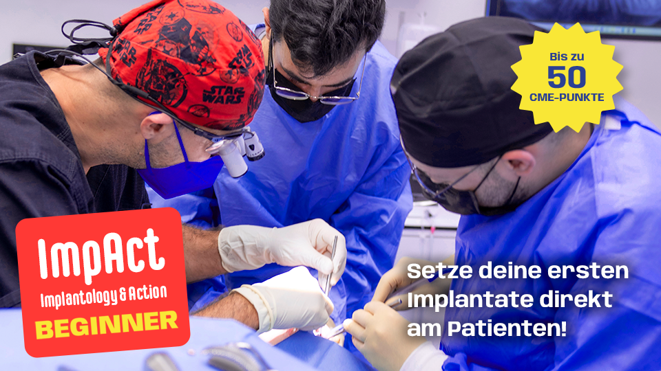 Bist du bereit, endlich ernsthaft mit der Implantologie zu starten? Dann ist „ImpAct (Implantology & Action) Beginner“ die perfekte Fortbildung für dich! Denn Schwimmen lernt man nur im Wasser!
