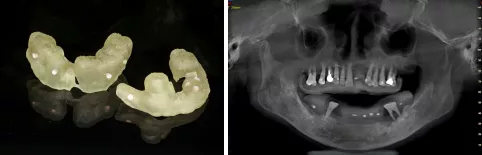 • 第三:本病历余留牙均松动三度,无法作为配准参考标志,我们借助个性化放射导板的方式完成CBCT与软组织信息与排牙信息的融合,并据此最终生成精准高的360数字化导板及即刻修复的临时义齿。