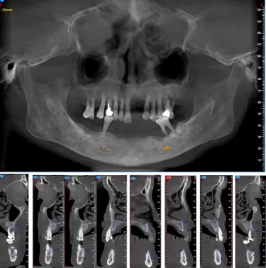 • CBCT示:21、22、27、31-33、35-37、41-45、47缺失,余牙牙槽骨吸收至根尖1/3。牙周膜间隙增宽。剩余牙槽骨丰满度一般。