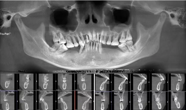 · 下颌多颗后牙缺失 ,上下前牙成扇形排列,余留牙除上中切牙 1度松动外,其余牙均2-3度松动。