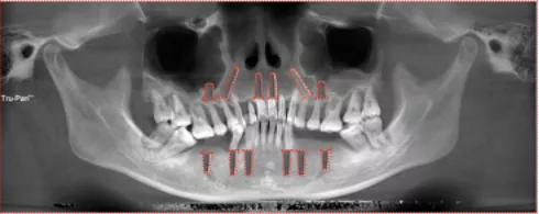 · 上下各计划植入6颗种植体。其中14、24种植体倾斜植入,15、25经牙槽嵴顶上颌窦提升植骨,其余牙位无需植骨。