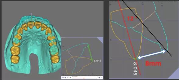 · 侧貌美学预告后,确定了上前牙矢状面前后向的位置关系,中切牙在矢状面上的位置变化:将唇倾的上前牙直立,上中切牙角度减小12度,切端内收8mm。