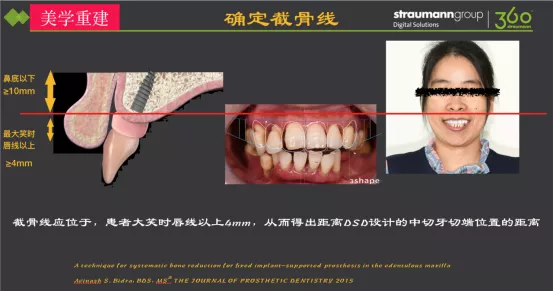 § 义龈部分与软组织的边缘线在大笑时位于唇线以下为高分险(HER),应将其置于唇线以上以降低美学风险。患者为高笑线,因此需要截骨,截骨线应位于患者最大笑时唇线以上4mm。
