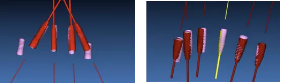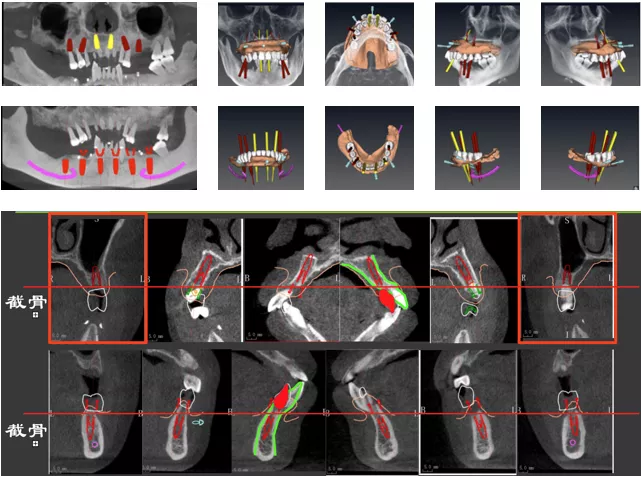 种植体位置设计,可见上前牙唇侧骨量过丰满,需适量去骨。同时上下颌均需要截骨处理。