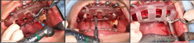 · 拔除部分牙齿,翻瓣,利用剩余牙齿支持组合导板,辅助基部导板就位固定,基部导板上缘做为去骨线,精确去骨。