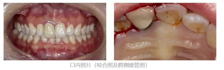 · 11牙舌侧硬腭区瘘管,触痛(+),探针出血,有少量溢脓;