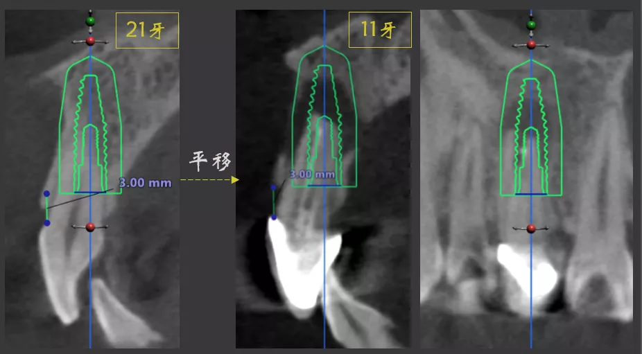 · 平移21牙釉牙骨质界至11牙,于CEJ下3mm处放置种植体。