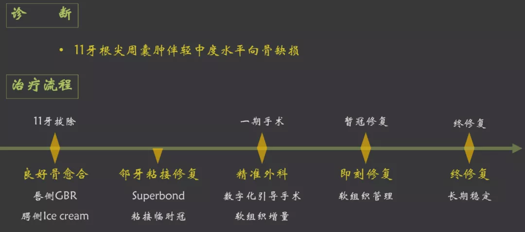 本病例为一例数字化引导下单颗前牙种植修复,患者11牙烤瓷修复体,长期瘘管。患者希望通过种植义齿获得更好的美观效果和功能,并希望减少缺牙期。患者唇舌侧骨板破坏,非即刻修复适应症。术前以修复为导向,复制对侧同名牙进行软硬组织管理方案的设计,采用GBR骨增量后种植手术分阶段治疗方案,最大限度地恢复硬组织轮廓,优化预后效果。骨增量手术中利用拔牙同期唇侧GBR+舌侧改良Ice Cream技术最大限度隔离炎症、保留剩余骨量。种植一期手术使用士卓曼360数字化解决方案保证种植方案与治疗实施的一致性,同时利用腭侧半厚瓣唇侧卷入技术增量软组织轮廓。患者对整个治疗流程及修复效果满意。