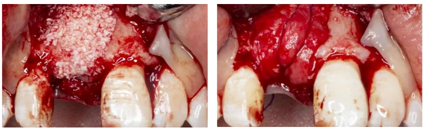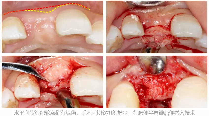 · 唇侧水平向引导骨再生,水平褥式缝合固定胶原膜,无张力关闭创口。