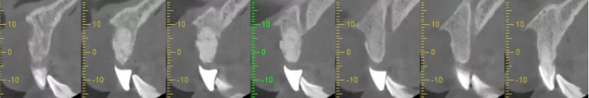 · 11根尖炎症波及唇舌侧骨板,唇侧骨板根方穿通,舌侧骨板基底处穿通;
